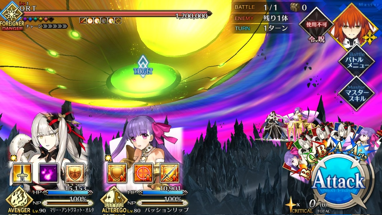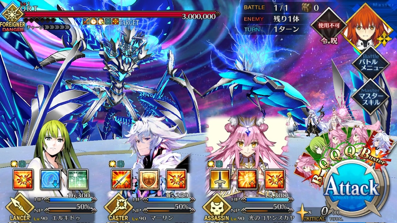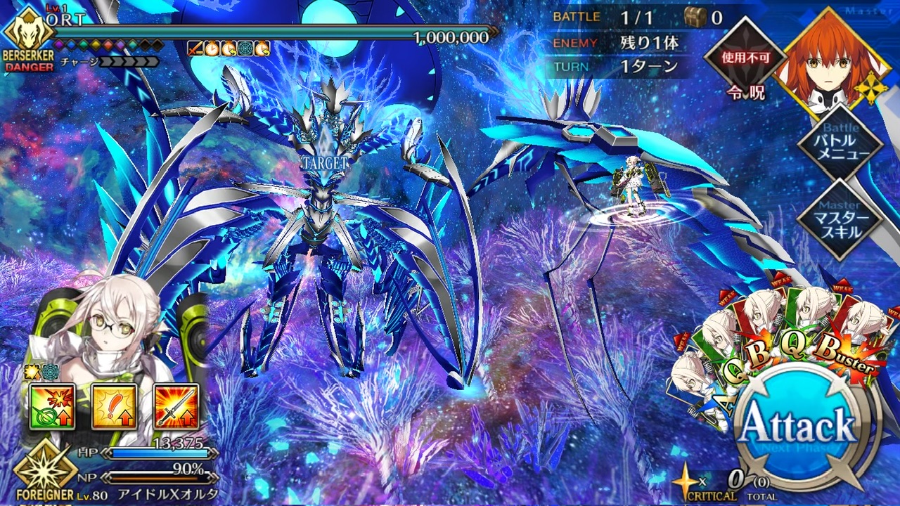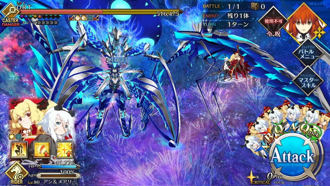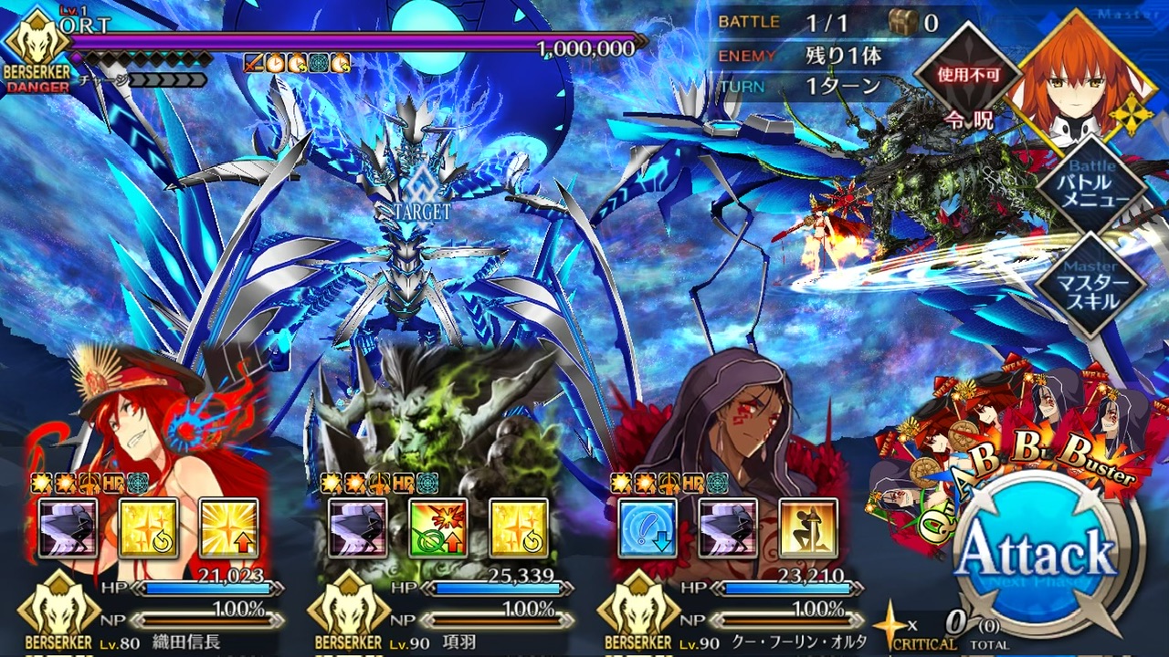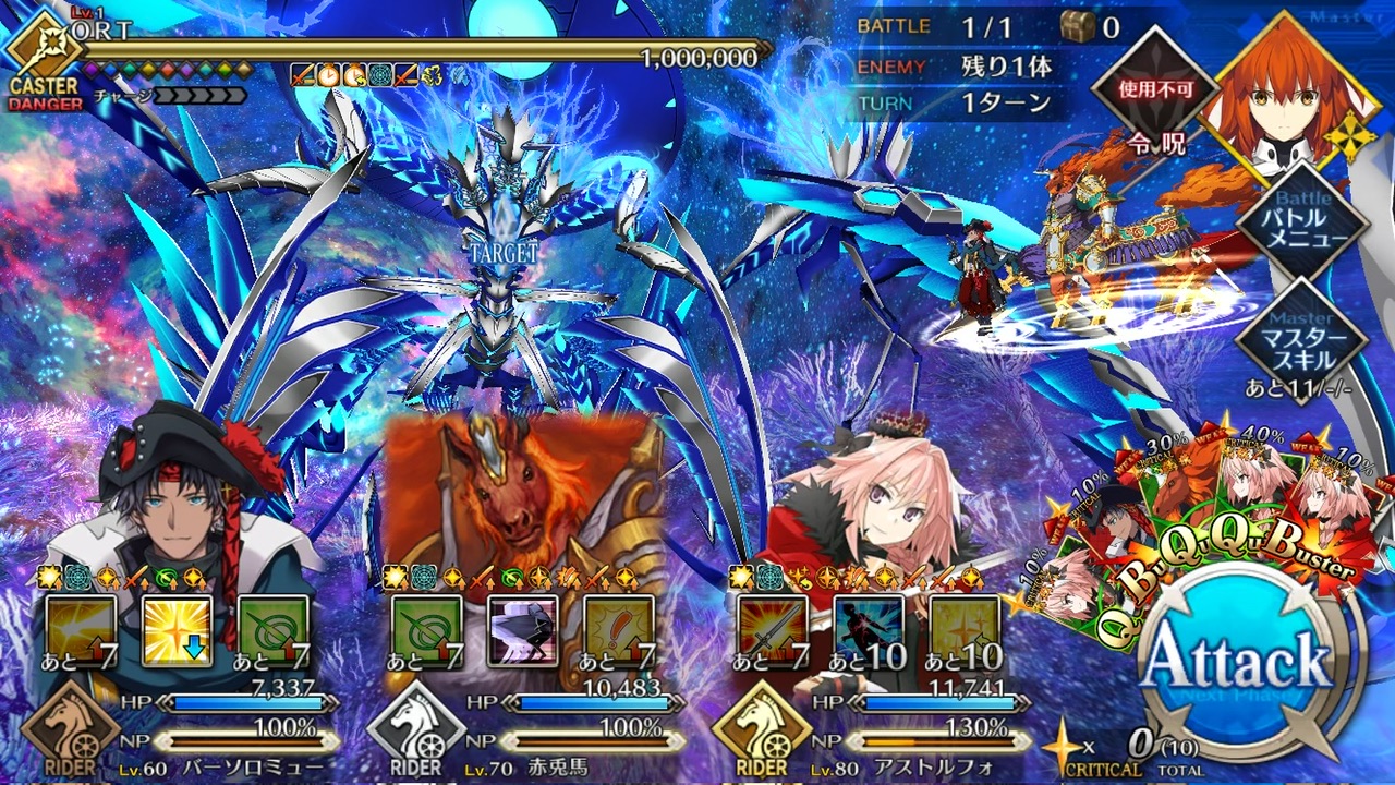 LOSTによる制限が無かったので恐らく手持ちの対ORT最強のサーヴァントを。NPC三騎がかなり削ってくれたり何だりで難無く4ターンで撃破できました💮