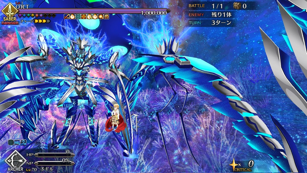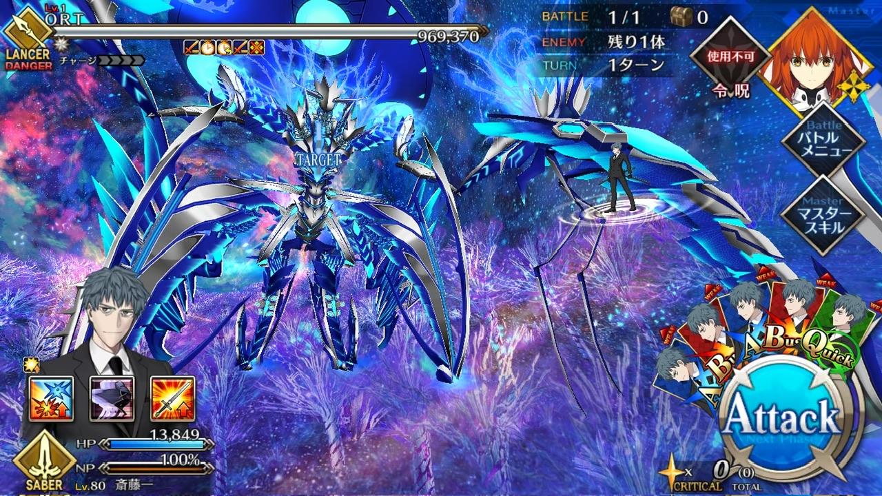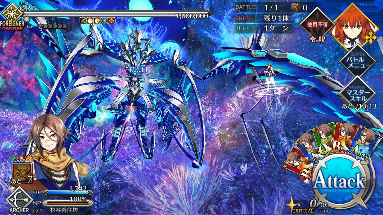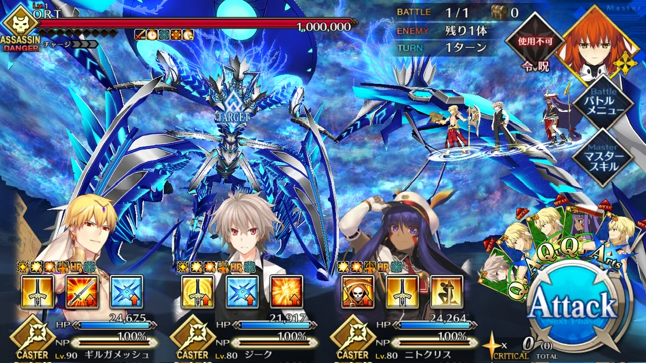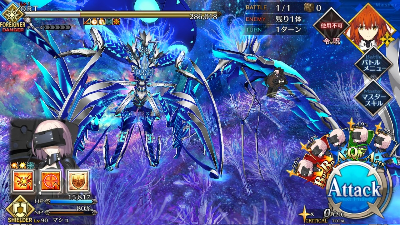 LOSTによる制限が無かったので恐らく手持ちの対ORT最強のサーヴァントを。NPC三騎がかなり削ってくれたり何だりで難無く4ターンで撃破できました💮