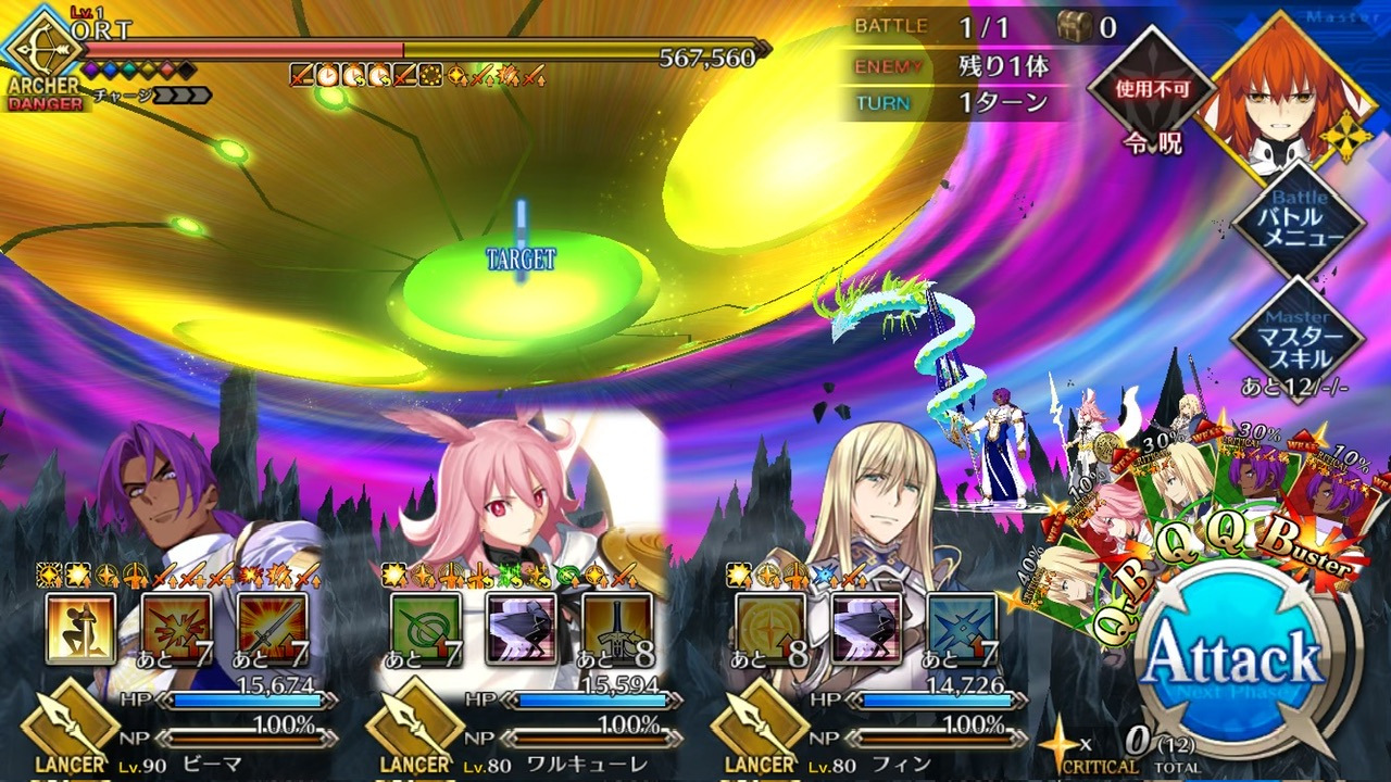 満を持しての三蔵ちゃん+サポーターのマーリンくん。三蔵ちゃんやばい。三蔵ちゃんのカードしか切っていないけどここまで持っていけたの凄すぎる。マーリンの英雄作成あってのことね。すごい本当に…。被弾はあんまり痛くなかったけど、チャージゲージが3つしかないうえ宝具が強いし怖いしでここまでの結果。惜しかったけどすごい!