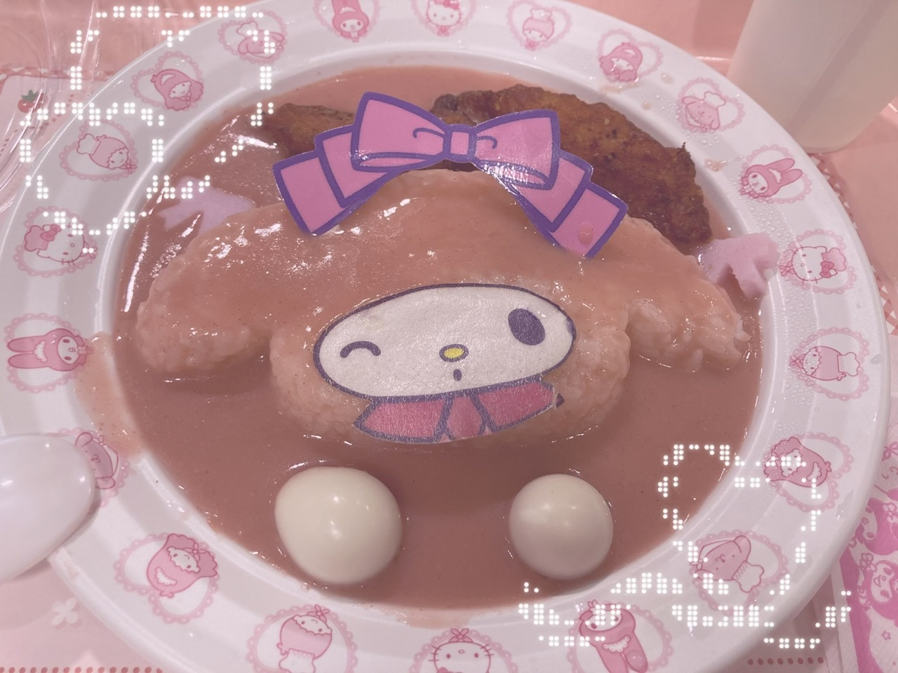 悩みに悩んだ末、🎀マイメロディのジューシートマトチキン♡ピンクリボンカレー🎀にしたの!♡マーガレットはぐでたまのチャーシュー麺!